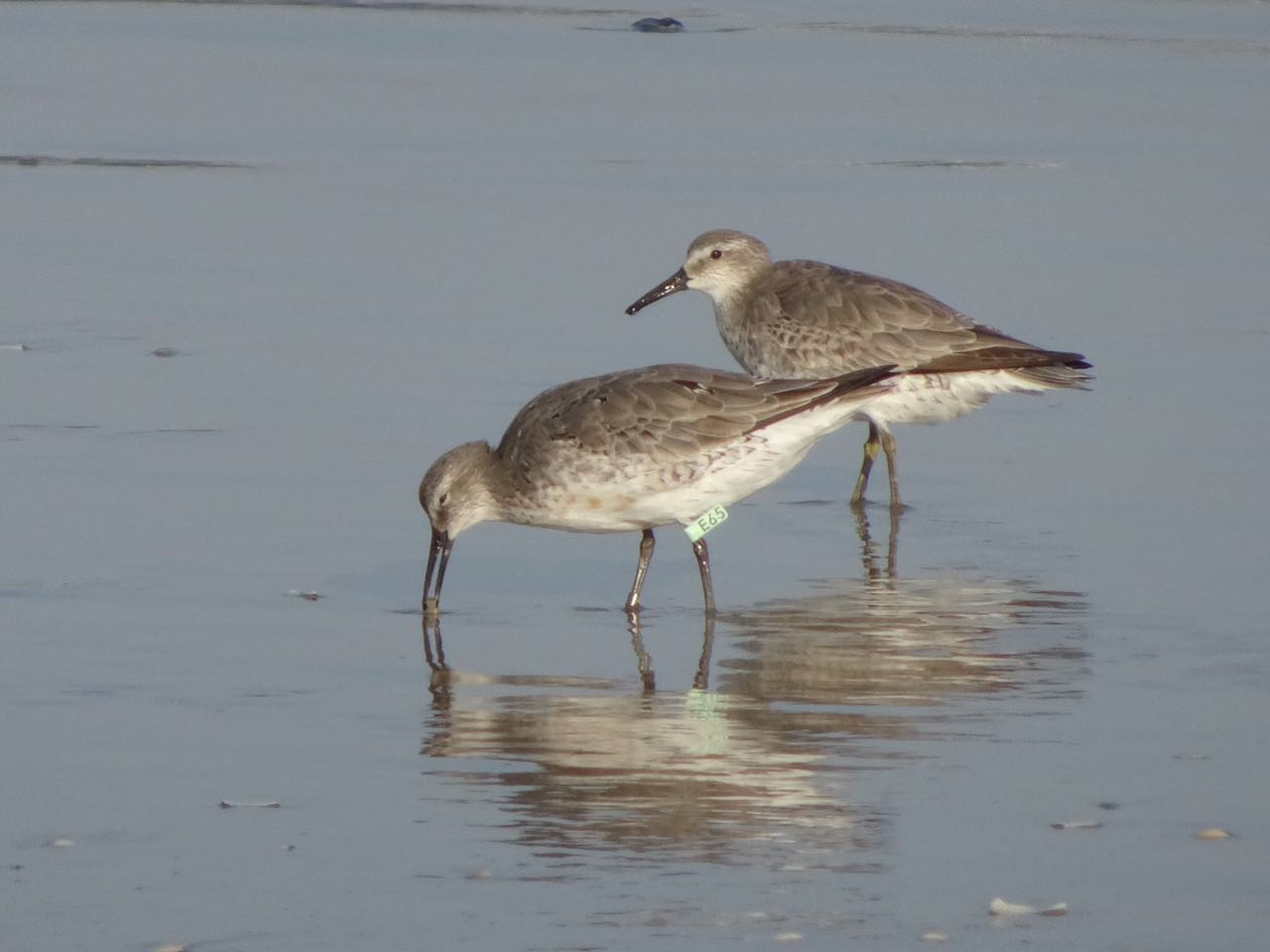 Maçaricos-do-peito-vermelho (Calidris canutus) avistados no Parque Nacional Lagoa do Peixe (RS). A cor verde da bandeirola com o código alfanumérico em preto em uma das aves indicada que ela foi marcada nos Estados Unidos. Foto de Danielle Paludo/CEMAVE