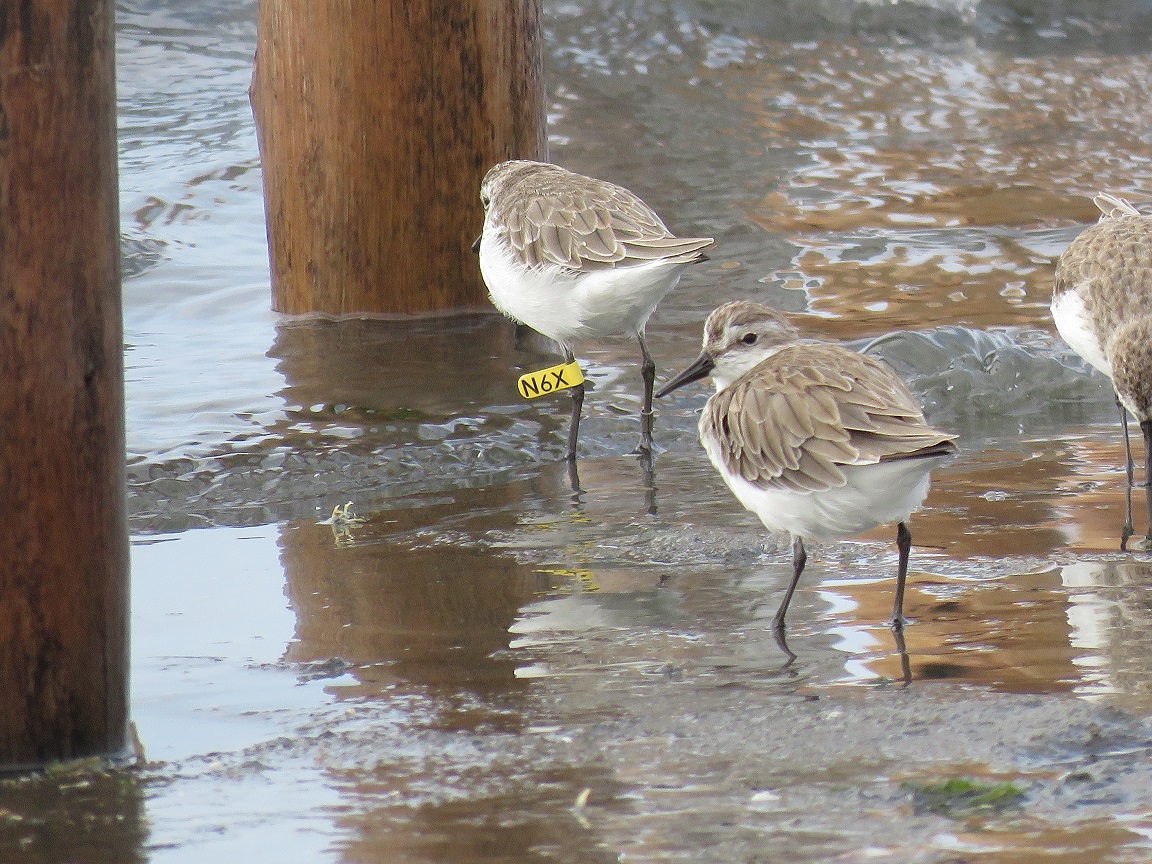 Maçaricos-rasteirinhos (Calidris pusilla) avistados no Peru. A cor amarela da bandeirola com o código alfanumérico em preto de uma das aves indicada que ela foi marcada no mesmo país. Foto: Danielle Paludo/CEMAVE