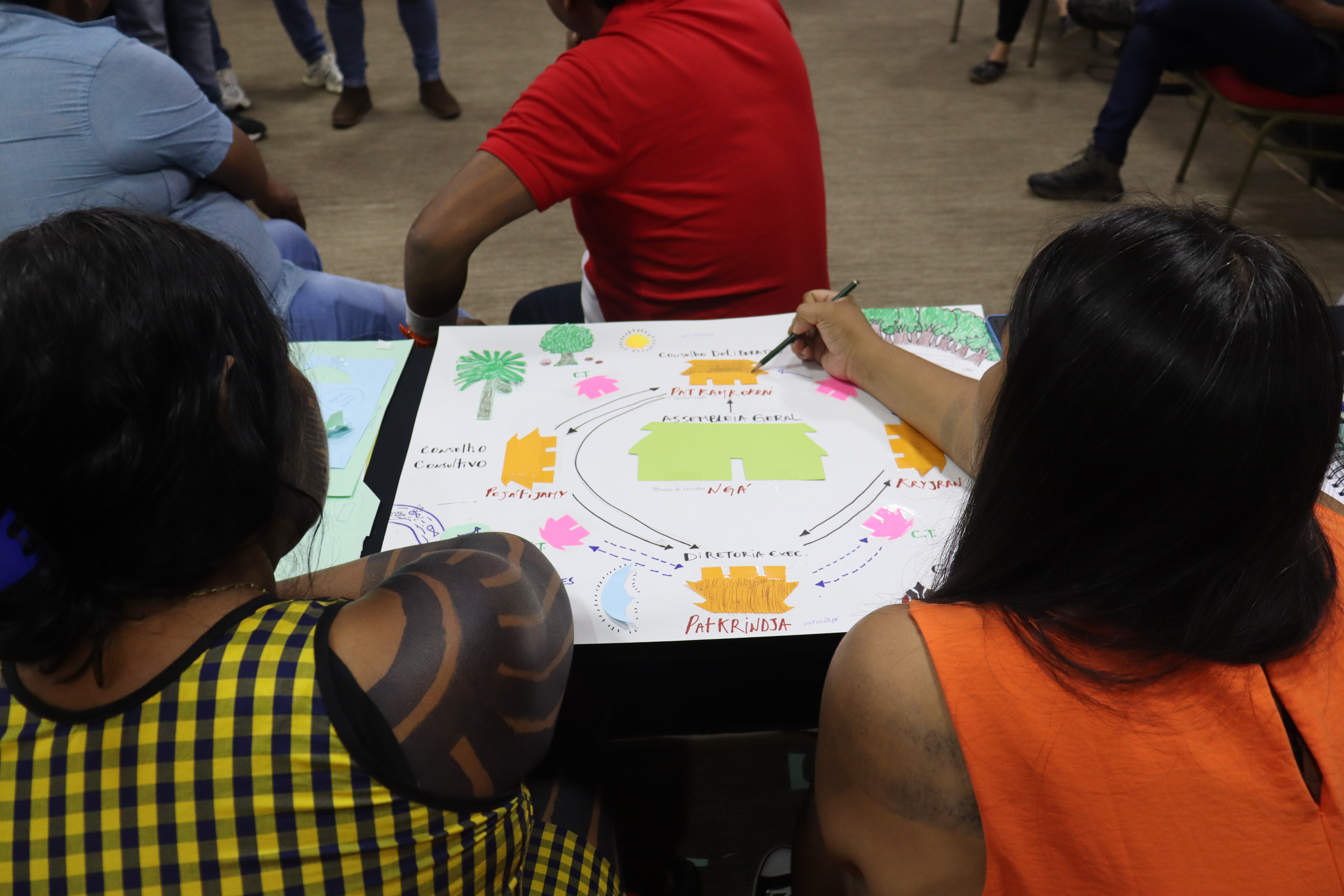 O último dia de reunião começou com os grupos engajados em discutir os detalhes finais de suas propostas antes de apresentá-las para os membros do Comitê e demais participantes. Com base nas trocas realizadas nos dias anteriores, cada grupo preparou um esboço de estrutura visando a autonomia Kayapó em relação aos kuben (não-indígenas) e o fortalecimento da gestão Mẽbêngôkre-Kayapó. A apresentação dos grupos abriu espaço para novas reflexões sobre as diferentes formas de organização, fazendo da dinâmica uma oportunidade para a construção de importantes marcos para a futura governança.