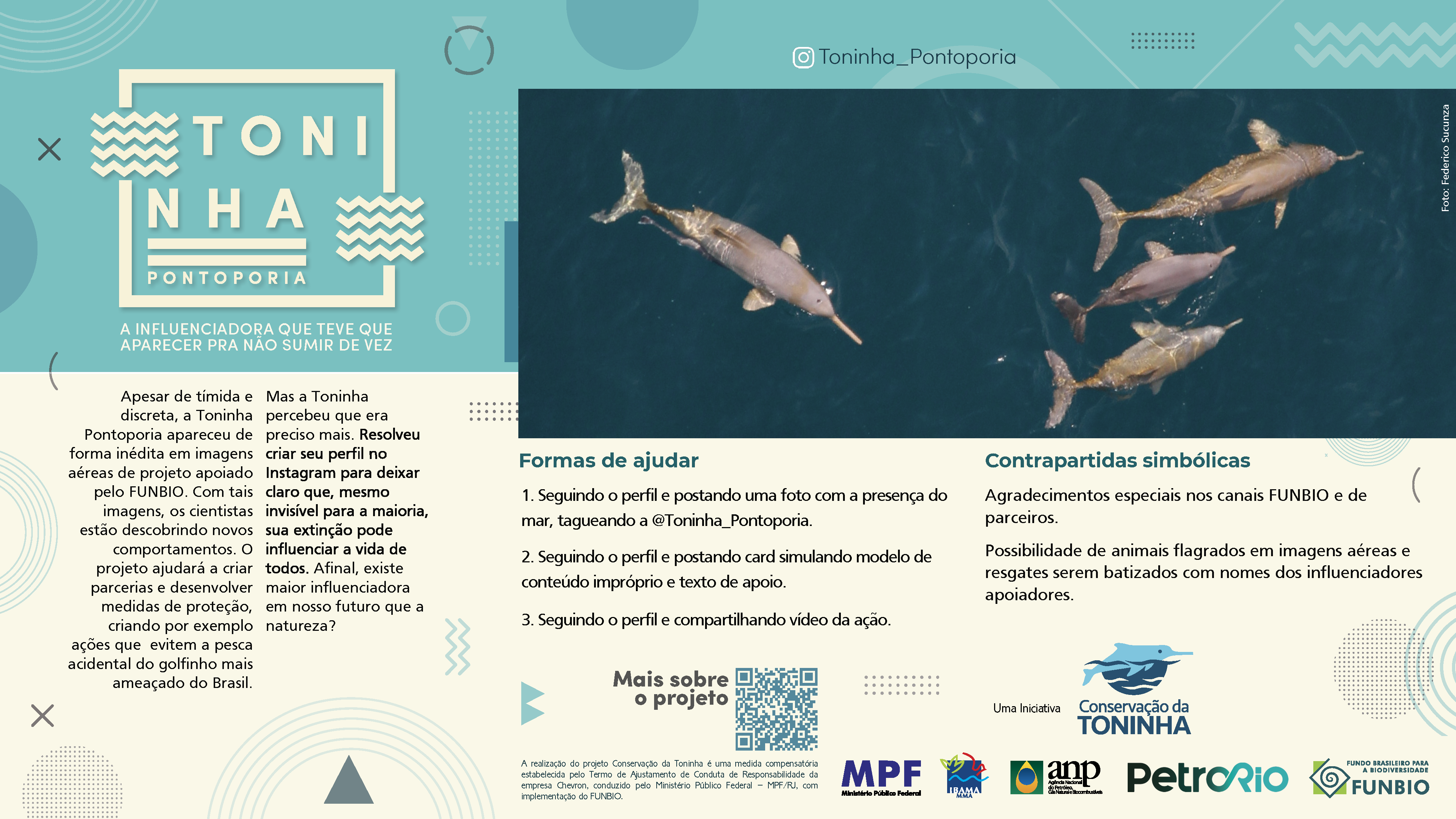 O Instagram @toninha_pontoporia foi criado para tornar a toninha, o golfinho mais ameaçado do Brasil, visível para evitar que desapareça. Aqui, você encontra conteúdos para participar e divulgar a toninha nas suas redes sociais.
